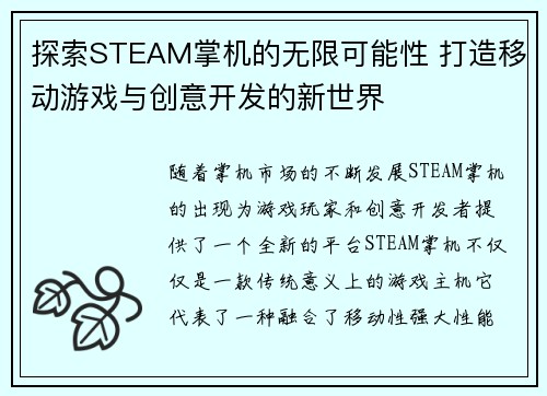探索STEAM掌机的无限可能性 打造移动游戏与创意开发的新世界