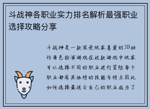 斗战神各职业实力排名解析最强职业选择攻略分享